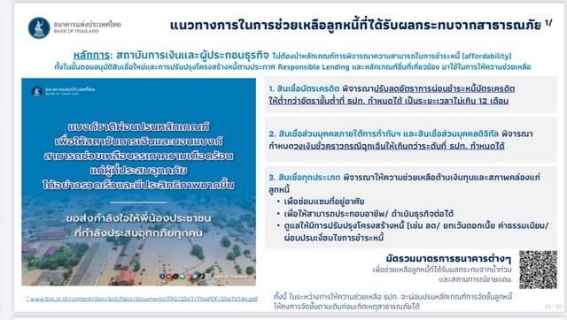 สำหรับลูกหนี้ที่ได้รับผลกระทบจากสาธารณภัยและสถานการณ์ชายแดน สามารถติดต่อสถาบันการเงินเพื่อบรรเทาความเดือดร้อนได้ โดยมีแนวทางการให้ความช่วยเหลือดังนี้ (1) สินเชื่อบัตรเครดิต ปรับลดอัตราการผ่อนชำระหนี้บัตรเครดิตให้ต่ำกว่าอัตราขั้นต่ำที่ ธปท. กำหนด เป็นระยะเวลาไม่เกิน 12 เดือน (2) สินเชื่อส่วนบุคคลภายใต้การกำกับของ ธปท. และสินเชื่อส่วนบุคคลดิจิทัล ให้วงเงินชั่วคราวกรณีฉุกเฉินเกินกว่าระดับที่ ธปท. กำหนดได้ (3) สินเชื่อทุกประเภท พิจารณาให้ความช่วยเหลือด้านเงินทุนและสภาพคล่องแก่ลูกหนี้ เพื่อซ่อมแซมที่อยู่อาศัย ให้สามารถประกอบอาชีพ / ดำเนินธุรกิจต่อได้ และดูแลให้มีการปรับปรุงโครงสร้างหนี้ โดย ธปท. ผ่อนปรนหลักเกณฑ์ เพื่อให้สถาบันการเงินสามารถช่วยเหลือบรรเทาความเดือดร้อนได้อย่างรวดเร็วและมีประสิทธิภาพมากขึ้น