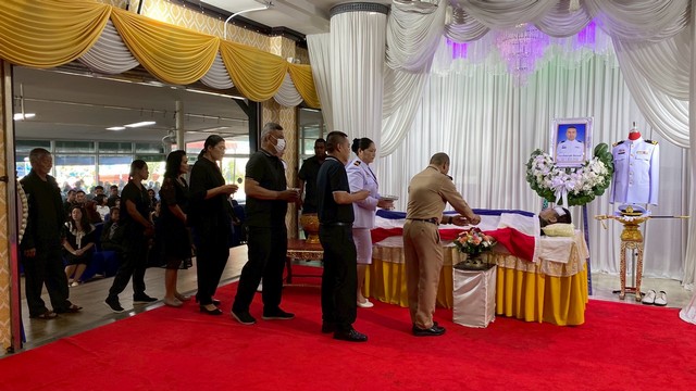ต่อมา นายธวัชชัย ศรีทอง ผู้ว่าราชการจังหวัดชลบุรี เป็นประธานอัญเชิญและวางพวงมาลาหลวงพระราชทาน จากพระบาทสมเด็จพระเจ้าอยู่หัว สมเด็จพระนางเจ้าฯ พระบรมราชินีนาถ และพระบรมวงศานุวงศ์ทุกพระองค์ หน้าหีบศพ เพื่อเป็นเกียรติแก่ผู้วายชนม์และครอบครัว โดยมีผู้บังคับบัญชา หน่วยทหาร ส่วนราชการ ภาครัฐ ภาคเอกชน ญาติ และประชาชนเข้าร่วมพิธีอย่างสมเกียรติ