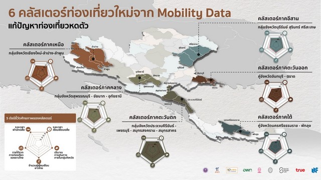 จากการวิเคราะห์เครือข่ายการเดินทางผ่าน mobility data พบว่า ประเทศไทยมีเส้นทางศักยภาพถึง 21 เส้นทางที่สามารถพัฒนาสู่การท่องเที่ยวแบบคลัสเตอร์ ตัวอย่างเช่น เชียงใหม่-ลำปาง-ลำพูน, นครปฐม-ราชบุรี-กาญจนบุรี, เพชรบุรี-ประจวบคีรีขันธ์-สมุทรสาคร-สมุทรสงคราม, ขอนแก่น-ชัยภูมิ เป็นต้น ทั้งนี้ กลุ่มคลัสเตอร์จะมีศักยภาพในการพัฒนาสู่เส้นทางท่องเที่ยวได้นั้น จำต้องมีองค์ประกอบสำคัญ 5 ข้อ ได้แก่