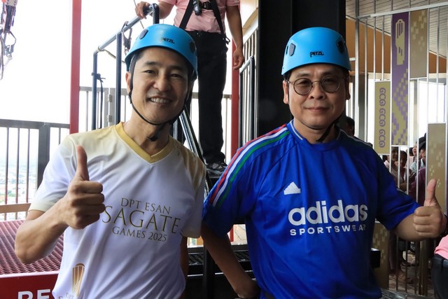 ร้อยเอ็ด…ผู้ว่าฯเมืองโหวด ขึ้นทดสอบเครื่องเล่นโหนสลิง( ZIP LINE ) ชั้น 34 ยัน พร้อมร้อยเปอร์เซ็นต์ ก่อนเชิญรมต.ท่องเที่ยวฯลั่นซ้องเปิดงาน 23 สิงหาคม ศกนี้