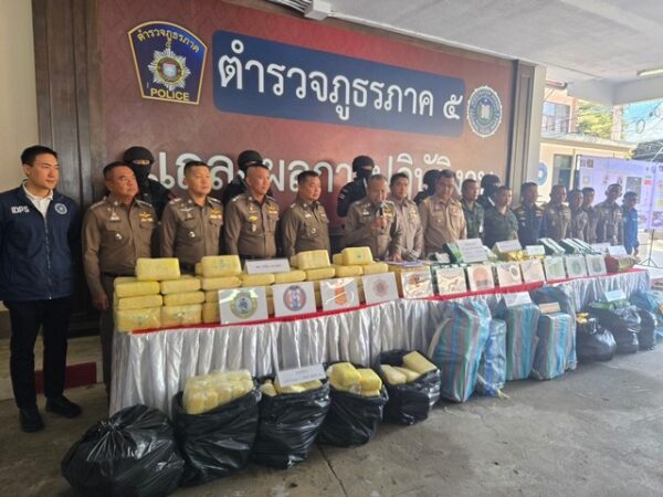 ตำรวจภูธรภาค 5 แถลงผลการจับกุมผู้ต้องหาคดียาเสพติดรายสำคัญ จำนวน 5 คดี รวมของกลางทั้งหมด ยาบ้า จำนวน 3,600,000 เม็ด, เคตามีน จำนวน 100 กก. และไอซ์ จำนวน 150 กก.
