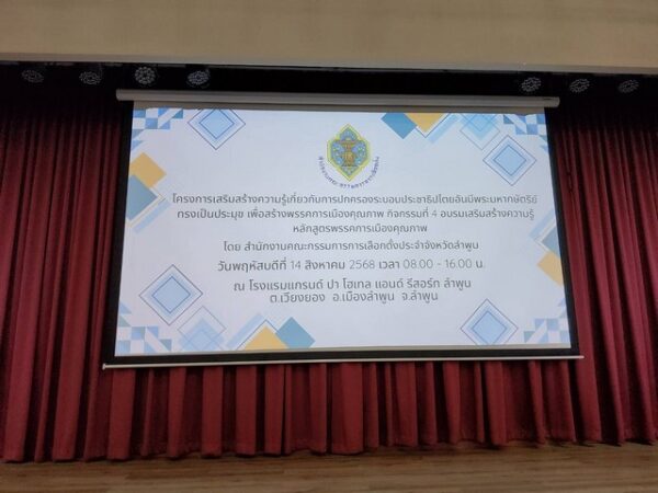 จัดโครงการเสริมสร้างความรู้เกี่ยวกับการปกครองระบอบประชาธิบไตยอันมีพระมหากษัตริย์ทรงเป็นประมุข เพื่อสร้างพรรคการเมืองคุณภาพ กิจกรรมที่ 4 อบรมเสริมสร้างความรู้หลักสูตรพรรคการเมืองคุณภาพ โดย สำนักงานคณะกรรมการการเลือกตั้งประจำจังหวัด ลำพูน(สนง.กกต.จว.ลำพูน) วันนี้(14 ส.ค. 68) ณ โรงแรมแกรมค์ ป่า โฮเทล แอนด์ รีสอร์ท ลำพูน ตำบลเวียงของ อำเภอเมืองลำพูน จังหวัดลำพูน
