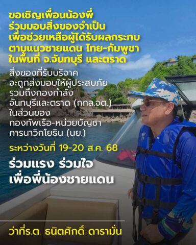 วันเสาร์ที่ 16 สิงหาคม 68 ชมรมแอโรบิคหมู่บ้านเสนานิเวศน์โครงการ 1 เขตลาดพร้าว กทม. เวลา17:30 น.ว่าที่.รตธนิตศักดิ์ ดารามั่น ผู้เคยดำรงตำแหน่งคณะทำงานรัฐมนตรีช่วยว่าการกระทรวงมหาดไทย เดินทางมารับมอบสิ่งของที่จำเป็นเพื่อสนับสนุนทหารที่อยู่ในแนวหน้ากองกำลังจันทบุรี ตราด ซึ่งตนเองพร้อมคณะจะเดินทางไปมอบด้วยตนเองในวันอังคารที่19 สิงหาคมนี้ โดยในวันนี้กลุ่ม FC แอโรบิคเสนานิเวศน์1ได้ร่วมแรงร่วมใจ นำของที่จำเป็นอาทิเช่น แป้งโยคี,ขนมยูโร่คัสตาร์ด,เบตาดีน, กระดาษทิชชู่เปียกรวมถึงกางเกงชั้นในชายเสื้อยืดถุงเท้ารวมถึงบะหมี่กึ่งสำเร็จรูป เพื่อมอบเป็นขวัญและกำลังใจให้กับ ทหารนาวิกโยธินที่ปฏิบัติหน้าที่ปกป้องอธิปไตยบริเวณแนวชายแดนจังหวัดจันทบุรีและจังหวัดตราด
