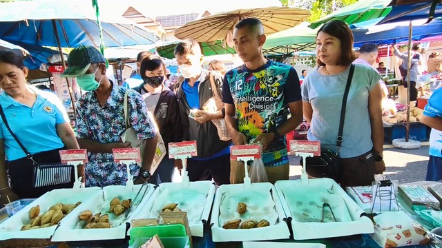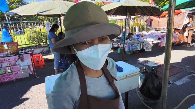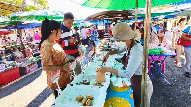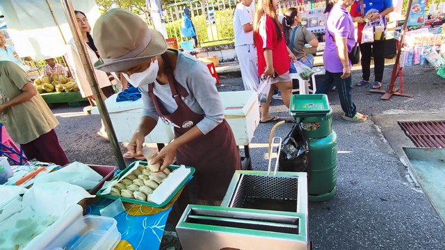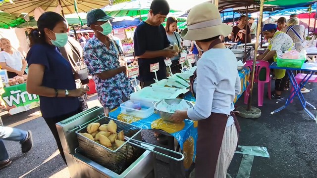 คุณจิรนันท์ กล่าวว่า ขายกะหรี่ปั๊บมา 8 ปีได้แล้ว ซึ่งเป็นสูตรของน้องสะใภ้ ที่เขาเลิกทำไปแล้ว เราก็มาสานต่อ เนื่องจากเสียดาย โดยมาขายที่ตลาดนัดที่นี่ทุกวันศุกร์ สำหรับราคากะหรี่ปั๊บ ทั้ง 5 ไส้ ลูกละ 12 บาท มีไส้ไก่ ไส้สังขยา ไส้ไก่หยอง ไส้ฝอยทอง และไส้ถั่ว ลูกค้าก็โอเคลูกค้าดี