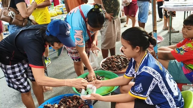 สงขลา-นักเรียนสาว ม. 4 โรงเรียนนวมินทราชูทิศทักษิณ ใช้เวลาว่างวันหยุดวันเสาร์วันอาทิตย์ ช่วยคุณแม่ ขายปูแสมดอง ในตลาดนัดอย่างคล่องแคล่ว