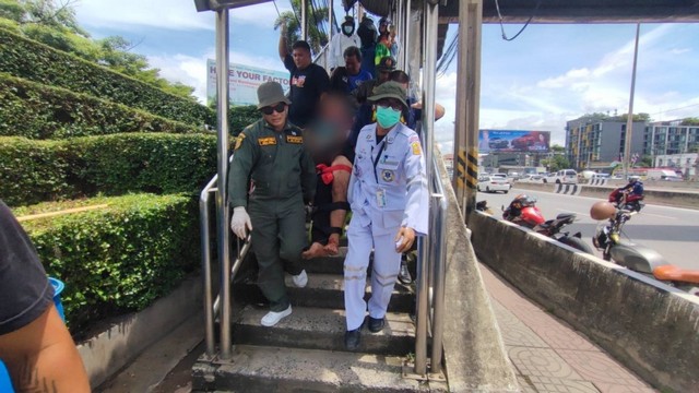 ปทุมธานี หนุ่มต่างชาติเครียดใช้กรรไกรทำร้ายตัวเอง หวังกระโดดสะพานลอย เจ้าหน้าที่ช่วยไว้ได้ทัน