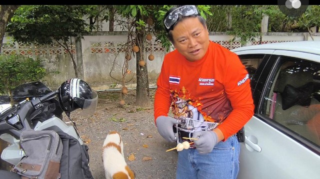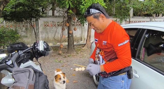 เจ้าหน้าที่กู้ภัยฯลูกข่ายเดินทางไปที่ลานจอดรถวัดหลวงพ่อปากแดง พบสุนัขเพศผู้สีขาวคาดน้ำตาล ชื่อเจ้าปีใหม่ เป็นหมาจรมีไม้ลูกขิ้นเข้าไปติดในปากเพดานด้านบน เจ้าหน้าที่กู้ภัยจึงได้ปิดทางล้อมให้เข้าไปอยู่ใต้โต๊ะแม่ค้าขายผักแล้วเอาอาหารให้กิน เพื่อว่าไม้ที่ติดคาปากจะหลุดออกมาได้เอง แต่ไม้ที่หักคาปากอยู่ไม่ยอมหลุดออก เจ้าหน้าที่กู้ภัยฯจึงได้นำลูกชิ้นที่เสียบไม้ไว้นำมาล่อให้เจ้าปีใหม่ได้อ้าปากขึ้นแล้วใช้อุปกรณ์ตัวคีบที่เตรียมมาคีบไม้ลูกชิ้นออกมาได้สำเร็จ