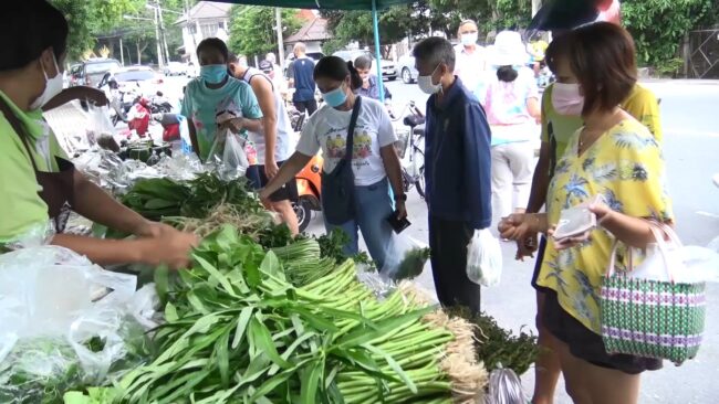เกษตรกรนำพืชผักจากสวนมาวางขายกันสดๆ โดยมีประชาชนและพ่อค้าแม่ค้าร้านอาหารมาเลือกซื้อนำไปปรุงอาหารกันอย่างคึกคักและขายดิบขายดีกันทุกคน