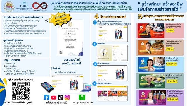 มูลนิธิเพื่อการพัฒนาดิจิทัล ร่วมมือกับ บริษัท อินฟินิตี้เดฟ จำกัด จัดขึ้นภายใต้โครงการ พัฒนาสื่อและสร้างโอกาสทักษะอาชีพ ของ กรมพัฒนาฝีมือแรงงาน กระทรวงแรงงาน โครงการสื่อการเรียนรู้ด้วยตนเอง (e-Learning) และการฝึกอบรมเพื่อเพิ่มโอกาสในการประกอบอาชีพและพัฒนาทักษะแรงงานรองรับนโยบาย Soft Power เพื่อสร้างโอกาสจริงแก่ผู้เรียนทุกกลุ่ม ตั้งแต่นักเรียน นักศึกษา แรงงานใหม่ แรงงานอิสระ ไปจนถึงประชาชนทั่วไป ให้เข้าถึงการเรียนรู้ที่ทันสมัย เรียนได้ทุกที่ ทุกเวลา และนำไปสู่การสร้างรายได้ทั้งระหว่างเรียน วัยทำงาน และหลังเกษียณ
