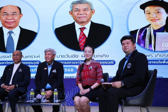 เวทีเสวนา “จากวันแรกสู่อนาคต 1 ทศวรรษ มหาวิทยาลัยเพื่อการพัฒนาท้องถิ่นอย่างยั่งยืน โดยนายเลิศบุศย์ กองทอง กรรมการสภามหาวิทยาลัยผู้ทรงคุณวุฒิ, ศ.ดร.ไชยณรงค์ นาวานุเคราะห์ กรรมการสภามหาวิทยาลัยผู้ทรงคุณวุฒิ, นายวันชัย ผโลทัยถเกิง กรรมการสภามหาวิทยาลัยผู้ทรงคุณวุฒิ, ดร.พราวพร เกียรติดำเนินงาม ตัวแทนภาคประชาชนในพื้นที่ จ.กาฬสินธุ์ ดำเนินการเสวนา โดย รศ.ดร.คคนางค์ รัตนานิคม กรรมการสภามหาวิทยาลัย และผศ.ดร.จักรินทร์ ตรีอินทอง กรรมการสภามหาวิทยาลัย