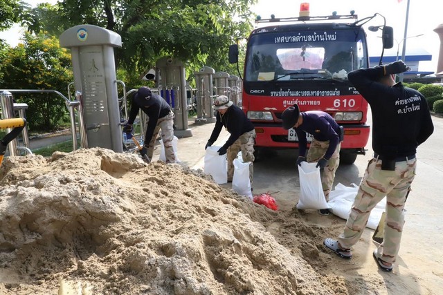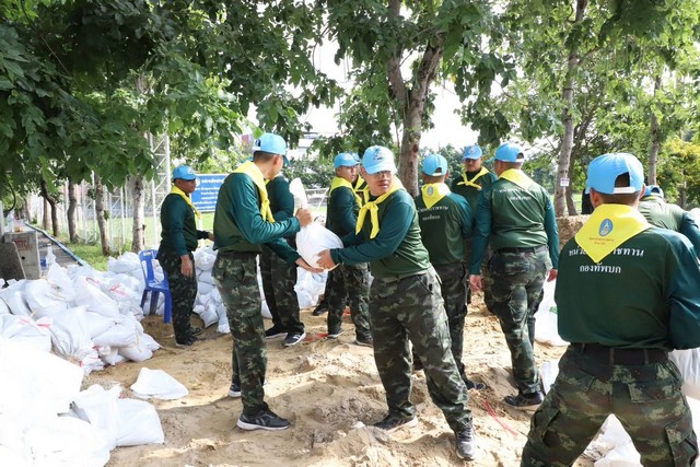 กองพันทหารสื่อสารที่ 13 กองพลทหารปืนใหญ่ต่อสู้อากาศยานเจ้าหน้าที่เทศบาลตำบลบ้านใหม่ กำนัน ผู้ใหญ่บ้าน ที่ร่วมกันบรรจุทรายใส่กระสอบ เพื่อนำไปทำคันกั้นน้ำ ไม่ให้น้ำที่เอ่อล้นจากแม่น้ำเจ้าพระยา ไหลเข้าครัวเรือนที่อยู่บริเวณริมแม่น้ำ พร้อมกันนี้ ผู้ว่าราชการจังหวัดปทุมธานี ได้สำรวจความมั่นคงแข็งแรงบริเวณริมเขื่อนแม่น้ำเจ้าพระยา หน้าวัดเทียนถวาย อำเภอเมืองปทุมธานี เพื่อตรวจสอบความพร้อมในการรองรับกับปริมาณน้ำที่ไหลผ่านมาในพื้นที่ด้วย