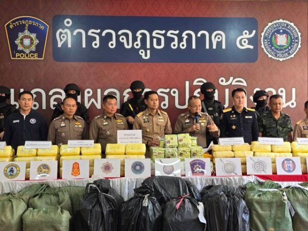 วันจันทร์ที่ 15 กันยายน 2568 เวลา 11.00 น. พล.ต.ท.กฤตธาพล ยี่สาคร ผบช.ภ.5 เป็นประธานการ แถลงข่าวผลการจับกุม และสืบสวนขยายผลคดียาเสพติดรายสำคัญของในพื้นที่ ภ.5 จำนวน 2 คดีได้แก่ สภ.เชียงของ จ.เชียงราย จับกุมผู้ต้องหาพร้อมของกลางยาบ้า จำนวน 6,000,000 เม็ดและ สภ.แม่โจ้ จ.เชียงใหม่ จับกุมผู้ต้องหาพร้อมของกลางยาบ้า จำนวน 3,730,000 เม็ด ,ไอซ์ จำนวน 100 กก. ณ ลานแถลงข่าว อาคารกองบังคับการสืบสวนสอบสวน ตำรวจภูธรภาค 5 อ.เมืองเชียงใหม่ จ.เชียงใหม่