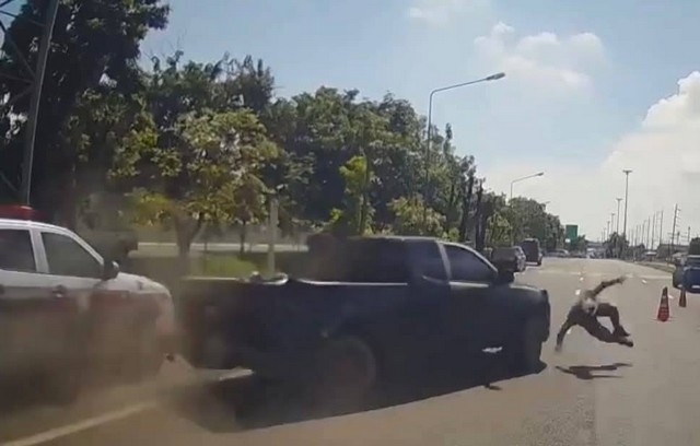 จึงไปเฉี่ยวใส่รถเก๋งคันข้างหน้าก่อน แล้วเสียหลังพุ่งมาใส่ ส.ต.อ.ภาณุมาศ ตามคลิปภาพดังกล่าว หลังจากนั้นเจ้าหน้าที่ได้นำตัวส่งโรงพยาบาลหนองกี่ มีอาการเจ็บบริเวณขาและสะโพก ตอนนี้อาการพ้นขีดอันตรายแล้ว