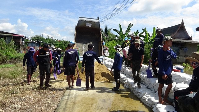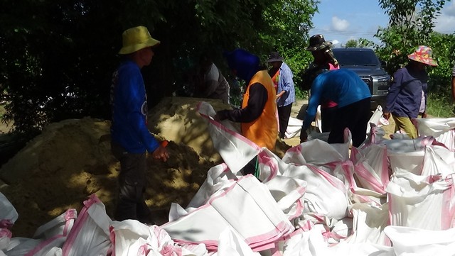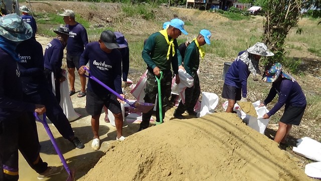 อ่างทอง นายอำเภอระดมทหารและผู้ต้องขังพร้อมชาวบ้าน เร่งทำแนวกระสอบทราย หลังเจ้าพระยาปล่อย 2,200 ลบ.ม.