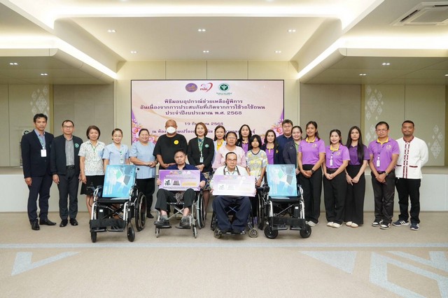 วันที่ 19 กันยายน 2568 ที่ห้องประชุมเปรื่อง อนุชวานิช โรงพยาบาลกาฬสินธุ์ พญ.จารุพรรณ มโนสิทธิศักดิ์ ผู้อำนวยการโรงพยาบาลกาฬสินธุ์ เป็นประธานในพิธีมอบอุปกรณ์ช่วยเหลือผู้พิการ อันเนื่องมาจากการประสบภัยที่เกิดจากการใช้รถใช้ถนน ประจำปีงบประมาณ พ.ศ.2568 จำนวน 2 ราย ซึ่งจัดขึ้นโดยความร่วมมือระหว่างสำนักงานขนส่งจังหวัดกาฬสินธุ์ สำนักงานพัฒนาสังคมและความมั่นคงของมนุษย์จังหวัดกาฬสินธุ์ และโรงพยาบาลกาฬสินธุ์ โดยงานกายอุปกรณ์ กลุ่มงานเวชกรรมฟื้นฟู นำโดย แพทย์หญิงนฎา จันทไทย หัวหน้ากลุ่มงานเวชกรรมฟื้นฟู และงานการพยาบาลชุมชน เพื่อให้ผู้ป่วยผู้พิการ มีชีวิตความเป็นอยู่ที่ดีขึ้น ช่วยเหลือตัวเองได้ และสามารถดำรงชีพในสังคมได้อย่างปกติ โดยมีหัวหน้าส่วนราชการ และหน่วยงานที่เกี่ยวข้องเข้าร่วมกิจกรรม