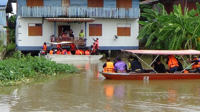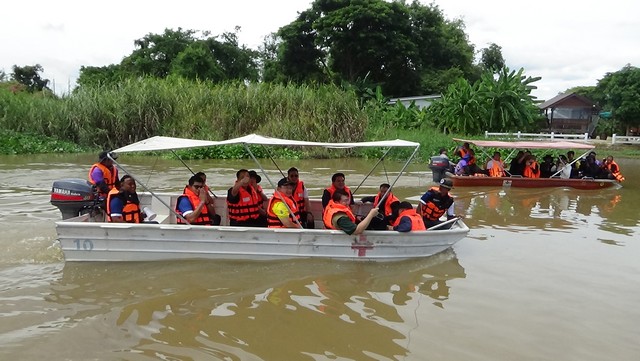 จากนั้นลงเรือล่องไปตาทแม่น้ำน้อย เพื่อดูสภาพบ้านเรือนประชาชนที่ถูกน้ำท่วม และมอบถุงยังชีพ ให้ประชาชนที่ต้องใช้เรือในการสัญจร พายเรือออกมารับถุงยังชีพถึงเรือนายกรัฐมนตรี
