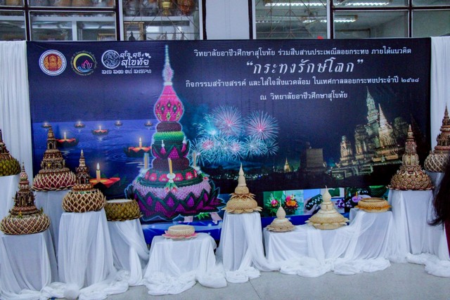 โดยเลือกใช้วัสดุที่สามารถย่อยสลายได้เองตามธรรมชาติ เพื่อช่วยลดปริมาณขยะและเป็นการอนุรักษ์สิ่งแวดล้อม ณ บริเวณหน้าห้องกิจกรรม วิทยาลัยอาชีวศึกษาสุโขทัย เพื่อส่งเสริมงานประเพณีลอยกระทง เผาเทียน เล่นไฟ จังหวัดสุโขทัย ประจำปี 2568 ปีนี้ 27 ตุลาคม – 5 พฤศจิกายน 2568. อุทยานประวัติศาสตร์สุโขทัย SUKHOTHAI Loy Krathong and Candle Festival October 27th – November 5th, 2025