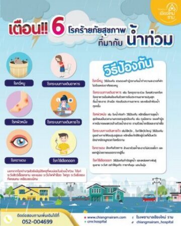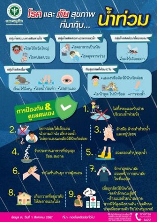 สำหรับ โรคและภัยสุขภาพที่ต้องระมัดระวังในช่วงน้ำท่วม มีดังนี้ 1) กลุ่มโรคระบบทางเดินหายใจ คือ โรคไข้หวัดใหญ่ อาการ : ไอ คัดจมูก น้ำมูก เจ็บคอ ไข้สูงนานเกิน 7 วัน ป้องกัน : รักษาสุขอนามัย เว้นระยะห่าง ปิดปากเวลาไอ/จาม และโรคปอดบวม 2) กลุ่มโรคติดต่อทางอาหารและน้ำ คือ โรคอาหารเป็นพิษและโรคอุจจาระร่วง อาการ : ถ่ายเหลว ปวดท้อง คลื่นไส้ อาเจียน ไข้ ป้องกัน : ดื่มน้ำสะอาด กินอาหารปรุงสุก ล้างมือก่อนกิน/หลังเข้าห้องน้ำ 3) กลุ่มโรคที่มักเกิดตามมากับน้ำท่วม คือ โรคไข้ฉี่หนู อาการ : ไข้สูง ปวดศีรษะ กล้ามเนื้อ ตาแดง เบื่ออาหาร ป้องกัน : เลี่ยงลุยน้ำ ควบคุมแหล่งที่อยู่อาศัยของหนู
