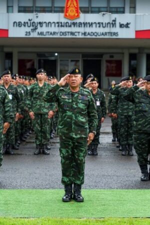 วันที่ 29 กันยายน 2568 เวลา 08.00 น. ณ กองบัญชาการมณฑลทหารบกที่ 25 ค่ายวีรวัฒน์โยธิน จังหวัดสุรินทร์ พลตรี ไชยนคร กิจคณะ ผู้บัญชาการมณฑลทหารบกที 25 เป็นประธานการจัดกิจกรรมเคารพธงชาติและร้องเพลงชาติไทย เนื่องในวันพระราชทานธงชาติไทย 28 กันยายน (Thai National Flag Day) ประจำปี 2568 พร้อมด้วย คณะนายทหาร , นายสิบ, ลูกจ้าง, นักศึกษาวิชาทหาร และกำลังพล มณฑลทหารบกที่ 25 ร่วมกิจกรรมเคารพธงชาติไทยและร้องเพลงชาติไทย เนื่องในวันพระราชทานธงชาติไทย ครบรอบ 108 ปี 28 กันยายน 2568