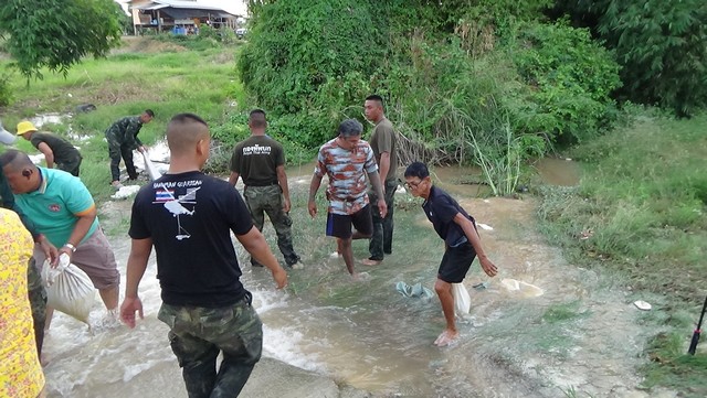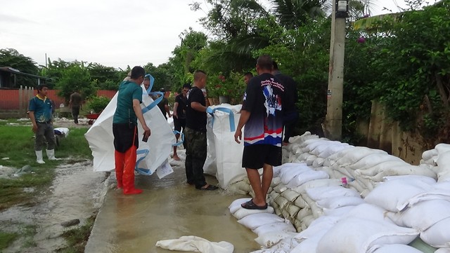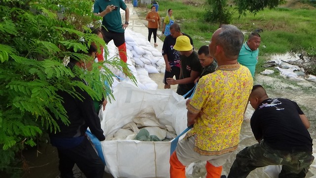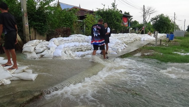 นายณัฐวุฒิ อนุโยธา นายอำเภอป่าโมก กล่าวว่า กระสอบทรายตรงนี้มันล้ม เดี๋ยวจะเอาบิ๊กแบ๊ก มาอุดยันแนวนี้ไว้ หวังว่าจะอยู่เราสู้เต็มที่ครับ เพราะน้ำสูงกว่า 10 ซม.
