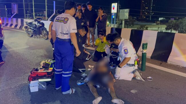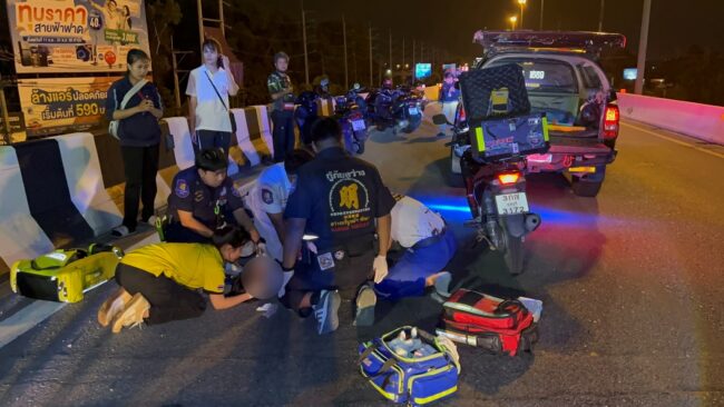 ที่เกิดเหตุพบรถจักรยานยนต์ ยามาฮ่า จีราโน่ สีดำ ทะเบียน 5 กจ 3587 ชลบุรี เสียหลักล้มคว่ำไถลไปชนกับแบริเออร์ราวสะพาน ขาขึ้นทางด่วนจนได้รับความเสียหาย มีนายธาวิน(นามสมมุติ)อายุ 18 ปี นักเรียนชั้นมัธยมศึกษา ปีที่ 6 ได้รับบาดเจ็บอาการสาหัส แขนขวาหักหายใจรวยริน เจ้าหน้าที่กู้ภัยฯ ให้การช่วยเหลือปฐมพยาบาลเบื้องต้นปั้มหัวใจเพื่อยื้อชีวิต ก่อนเคลื่อนย้ายส่งโรงพยาบาลอย่างเร่งด่วน