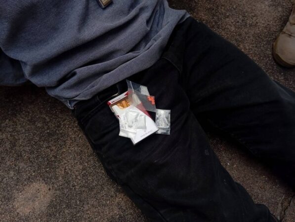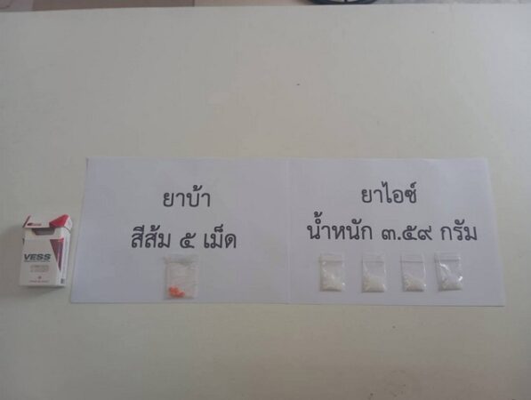 – ของกลางเป็น ยาบ้า(สีส้ม) จำนวน 5 เม็ด เเละยาไอซ์ น้ำหนัก 3.59 กรัม