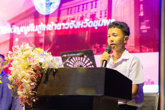 1 นางสาวสุภัชชา พรมโยธา โรงเรียนศรียาภัย อำเภอเมือง เข้ารับจาก นายเธียรชัย ชูกิตติวิบูลย์ ผู้ว่าราชการจังหวัดชุมพร
