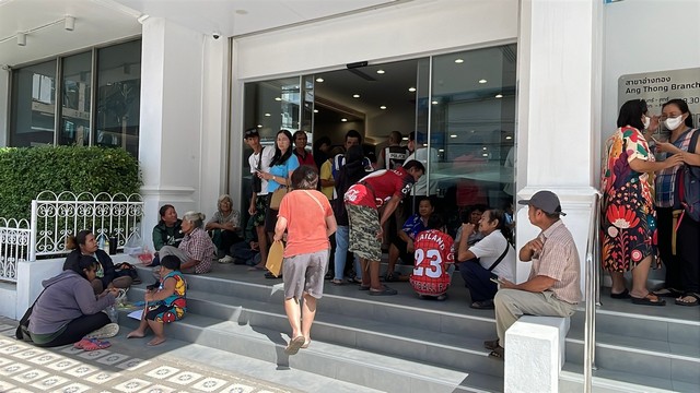 14.30 น. ผู้ประกอบการร้านค้าที่เข้าร่วมโครงการคนละครึ่งพลัส มาติดต่อขอใช้บริการที่ธนาคารกรุงไทย สาขาอ่างทอง ตั้งแต่ช่วงสายวันนี้ จนถึงปัจจุบัน ทำให้ท้ายแถวล้นออกมานอกตัวอาคารสำนักงานธนาคารกรุงไทย สาขาอ่างทอง