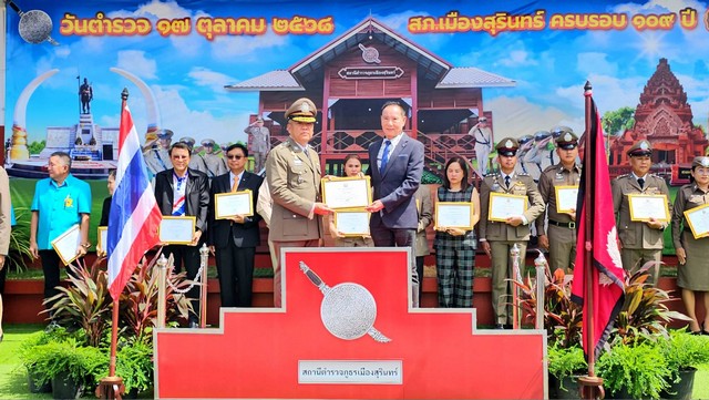 รวมถึงการรณรงค์ป้องกันการเกิดอุบัติเหตุทางถนนในช่วงเทศกาลต่างๆ จนประสบผลสำเร็จเป็นอย่างดี ทำให้สถิติผู้เสียชีวิตลดลง ตำรวจภูธรจังหวัดสุรินทร์จึงได้มอบใบประกาศเกียรติคุณให้แก่ข้าราชการตำรวจที่มีผลงานดีเด่นด้านต่างๆ และผู้ที่ให้ความร่วมมือและช่วยเหลือสนับสนุนกิจการของตำรวจ รวมถึงประชาชน ผู้ทำคุณประโยชน์ให้กับกิจการของตำรวจ หรือผู้ช่วยเหลืองานในหน้าที่ตำรวจด้วย ซึ่ง พลตำรวจตรี สุคนธ์ ศรีอรุณ ผู้บังคับการตำรวจภูธรจังหวัดสุรินทร์ ได้ให้โอวาท พร้อมกับมอบใบประกาศเกียรติคุณเพื่อยกย่องเชิดชูเกียรติ แก่ผู้ได้รับใบประกาศเกียรติคุณดังกล่าว พลตำรวจตรี สุคนธ์ ศรีอรุณ ได้ให้โอวาทแก่ข้าราชการตำรวจจังหวัดสุรินทร์ เนื่องใน วันตำรวจ ว่า วันนี้ (17 ตุลาคม ) ของทุกปีถือเป็นวันมงคลของข้าราชการตำรวจ