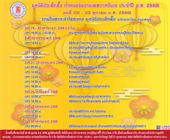 เนื่องในเทศกาลกินเจ ประจำปี 2568 มูลนิธิป่อเต็กตึ๊ง ขอเชิญชวนศิษยานุศิษย์และสาธุชนทุกท่าน ร่วมถือศีล อิ่มบุญ อิ่มใจ ศีลกินผัก ละเว้นเนื้อสัตว์ โดยตลอดเทศกาลกินเจ มูลนิธิฯ จัดให้มีบริการอาหารเจ [บรรจุใส่ถุง] แก่ประชาชนฟรี วันละ 2 มื้อ (เช้า และ กลางวัน) เริ่มมื้อเที่ยงของวันที่ 20 ตุลาคม – 29 ตุลาคม 2568 ณ บริเวณทางเข้าสำนักงานมูลนิธิฯ ทั้งนี้ มูลนิธิฯ ขอความกรุณาประชาชนผู้เข้ารับบริการอาหารเจ นำถุงหิ้ว/ถุงผ้า มาบรรจุอาหารด้วยทุกครั้ง