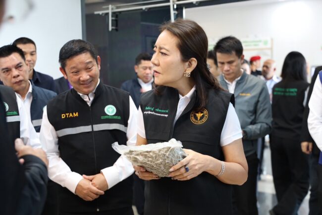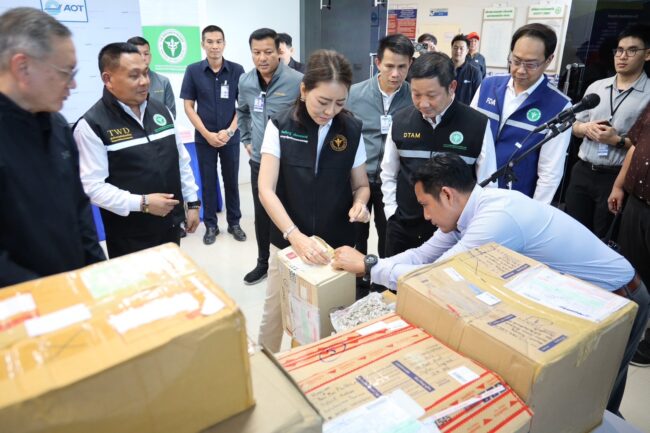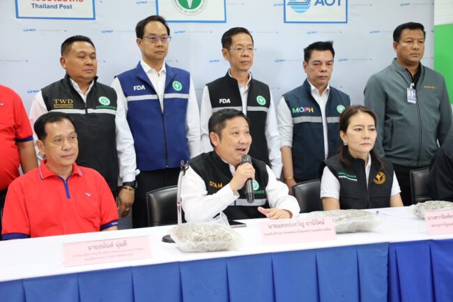 วันที่ 21 ตุลาคม 2568 เวลา15.30 น.ที่สนามบินสุวรรณภูมิ กรมการแพทย์แผนไทยและการแพทย์ทางเลือก ร่วมมือ บริษัท ไปรษณีย์ไทย จำกัด ตรวจยึด พัสดุต้องสงสัย คาดว่าจะเป็นกัญชาลักลอบส่งออก กว่า 1,500 ชิ้น ผ่านระบบขนส่งพัสดุหลังพบพัสดุต้องสงสัยตกค้างจำนวนมาก ที่ศูนย์ไปรษณีย์ไทย ท่าอากาศยานสุวรรณภูมิ นางสาวจิตศ์ตราฎ์ หมีทองธนกรณ์ เลขานุการรัฐมนตรีว่าการกระทรวงสาธารณสุข และประธานคณะกรรมการปราบปรามการกระทำความผิดด้านกฎหมายของกระทรวงสาธารณสุข, นายแพทย์วิทิต สฤษฎีชัยกุล รองเลขาธิการคณะกรรมการอาหารและยา,นายวิน ธนพชรโภคิน ประธานคณะทำงานรัฐมนตรีว่าการกระทรวงสาธารณสุข เปิดเผยว่ากระทรวงฯ ได้ตั้งคณะกรรมการร่วมกับไปรษณีย์ไทยและหน่วยงานที่เกี่ยวข้อง เพื่อป้องกันและปราบปรามการลักลอบ ส่งออกกัญชาไปต่างประเทศ พร้อมวางแนวทางตรวจสอบพัสดุบันทึกหลักฐานและดำเนินคดีตามกฎหมาย