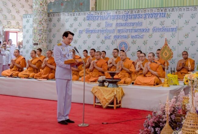 วันที่ 24 ตุลาคม 2568 เวลา09.59 น.นายปิ่นสาย สุรัสวดี อธิบดีกรมสรรพากร และคณะน้อมนำผ้าพระกฐินพระราชทานไปถวาย แด่พระภิกษุสงฆ์ ที่จำพรรษากาลถ้วนไตรมาส ณ วัดพระธาตุช่อแฮ พระอารามหลวง จังหวัดแพร่โดยมีนายชัยสิทธิ์ ชัยสัมฤทธิ์ผล รองผู้ว่าราชการจังหวัดแพร่ ปฏิบัติราชการแทนผู้ว่าราชการจังหวัดแพร่ ผู้บริหารกรมสรรพากร พร้อมคณะและหัวหน้าส่วนราชการในจังหวัดแพร่ พุทธศาสนิกชน ร่วมด้วย ได้ยอดปัจจัยทะนุบำรุงพระพุทธศาสนา จำนวน 6,379,999.99 บาท ในโอกาสนี้กรมสรรพากรได้มอบเงินบำรุงการศึกษาแก่โรงเรียนและมอบให้หน่วยงานต่างๆ จำนวน 17 แห่งๆละ 5,000 บาท ดังนี้/สำนักศาสนศึกษาวัดพระธาตุช่อแฮ พระอารามหลวง/โรงเรียนเมืองแพร่ /โรงเรียนบ้านป้าแดง (วันรัตตวิทยา)/โรงเรียนวัดต้นไคร้ /โรงเรียนบ้านพันเชิง (วงศ์หล้าราษฎร์บำรุง)/โรงเรียนบ้านนาจักร (จักรราษฎร์บำรุง) /โรงเรียนวัดกาญจนาราม (ประชาชนูทิศ) /โรงเรียนบ้านไร่หลวง อำเภอวังชิ้น/ โรงเรียนอนุบาลเทศบาลตำบลช่อแฮ