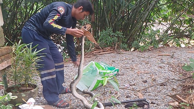 หลังจากนายทวีศักดิ์ ฯ ได้รับแจ้งจึงพร้อมด้วยกู้ชีพ อบต.สะท้อน รีบนำอุปกรณ์ในการจับงู เข้าตรวจสอบทันที เมื่อเจ้าหน้าที่ฯไปถึงก็รีบเดินไปยังกอไผ่ที่หน้าบ้าน ก็พบ ว่ามีงูจงอางตัวใหญ่ ยาวประมาณ 3.10 เมตร ถูกงูเหลือม ความยาวเกือย 3 เมตร รัดคออยู่ข้างก่อไผ่ เจ้าหน้าที่ จึงใช้อุปกรณ์ในการจับงูเข้าทำการจับงูเอาออกมาอยู่ในที่โล่ง เพื่อทำการแยกงูทั้งสองตัวให้ออกจากกัน โดย เจ้าหน้าที่ต้องใช้ความระมัดระวังในการจับงูแยกออกจากกัน เนื่องจาก หากพลาดก็อาจจะถูกงูกัดเอาได้