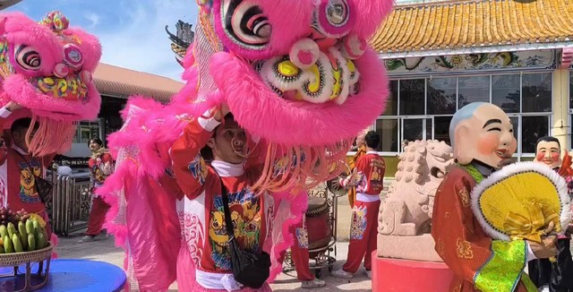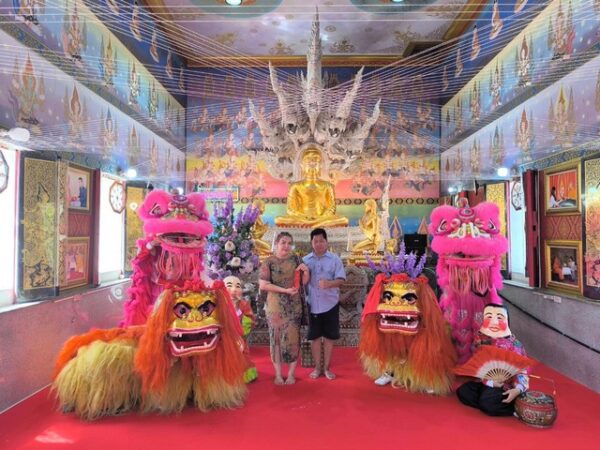 นครนายก – นักท่องเที่ยวนำสิงโตมาแก้บนองค์หลวงพ่อเสาร์ 5 และสิ่งศักดิ์สิทธิ์ในวัดธรรมปัญญาพร้อมจุดประทัดขอเลขเด็ด