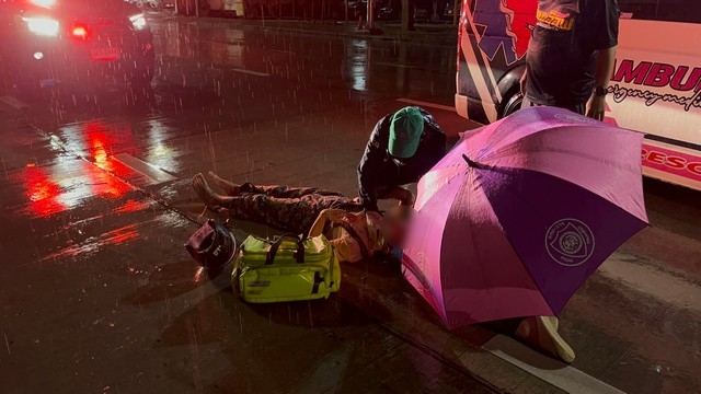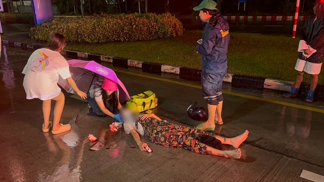 ชลบุรี-หนุ่มขี่ จยย.ผ่าสายฝนถนนลื่นชนท้ายรถขยะเจ็บสาหัส