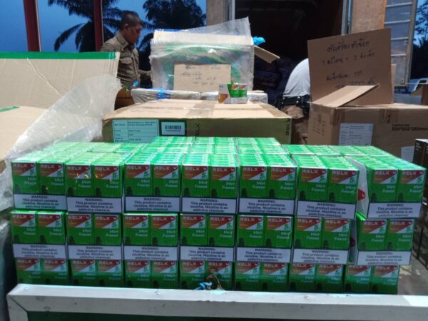 - บุหรี่ไฟฟ้าชนิดต่าง ๆ รวมประมาณ 40 ลัง อยู่ระหว่างตรวจนับ ประกอบด้วย
