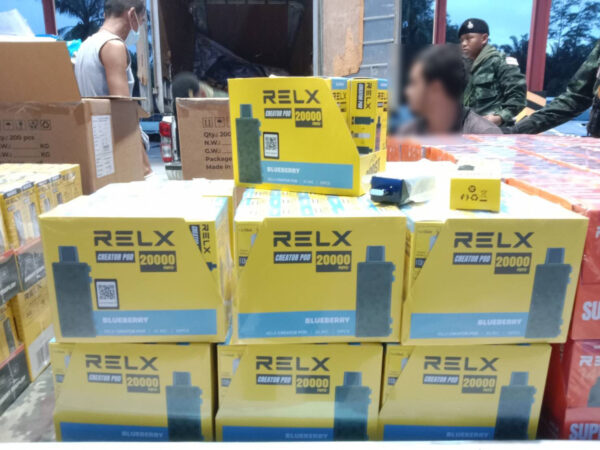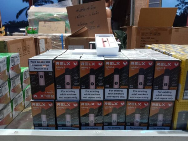 - บุหรี่ไฟฟ้าชนิดต่าง ๆ รวมประมาณ 40 ลัง อยู่ระหว่างตรวจนับ ประกอบด้วย