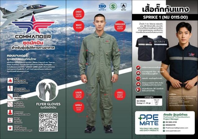 ชุดนักบิน COMMANDER ออกแบบเพื่อการปฏิบัติภารกิจที่ต้องการความปลอดภัยสูงสุด ผลิตด้วยเส้นใย Teijinconex® ที่มีคุณสมบัติ ทนความร้อนได้สูงถึง 1,000 องศาเซลเซียส ป้องกันการติดไฟ ไม่ลามไฟ และช่วยลดการถ่ายเทความร้อนในสถานการณ์ฉุกเฉิน เส้นใยชนิดนี้ยังมีคุณสมบัติป้องกันไฟฟ้าสถิต ระบายอากาศได้ดี และมีความยืดหยุ่นสูง ทำให้สวมใส่สบายและคล่องตัวในการปฏิบัติภารกิจ ผลิตภัณฑ์ได้รับการรับรองตามมาตรฐาน ISO 9001 International Standard, SGS, UL, BTTG, AITEX, MIL-C-83141A และมาตรฐาน MiT (Made in Thailand) ซึ่งใช้ในอุตสาหกรรมการบินระดับสากล