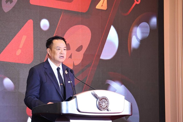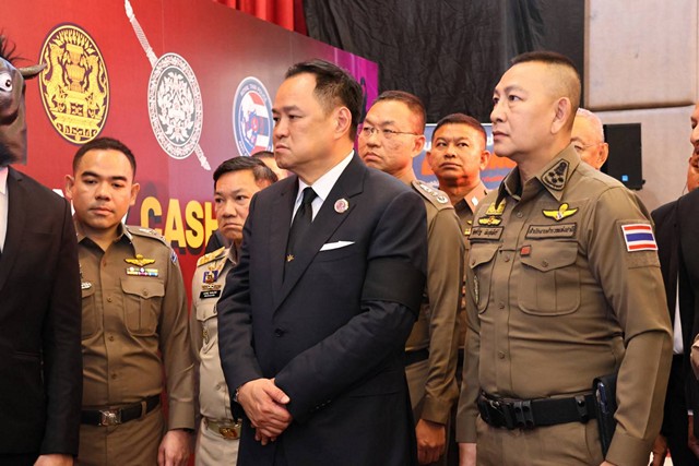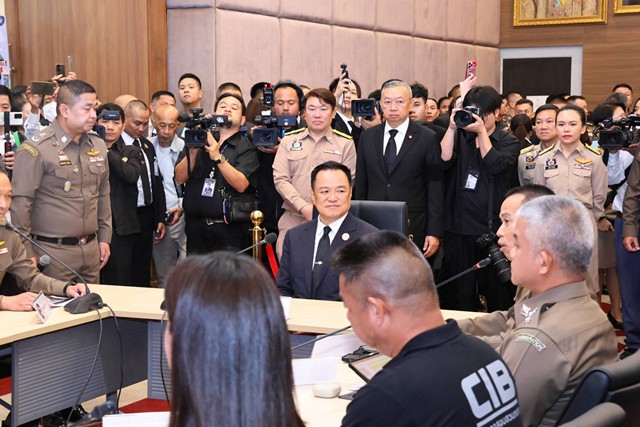 วันนี้ (10 พฤศจิกายน 2568) เวลา 10.00 น. นายอนุทิน ชาญวีรกูล นายกรัฐมนตรีและรัฐมนตรีว่าการกระทรวงมหาดไทย เป็นประธานการแถลงข่าวการป้องกันและปราบปรามการกระทำความผิดอาชญากรรม ทางเทคโนโลยี “รวมพลังคนไทย ต้านภัยสแกมเมอร์” United Thailand Against Scammers ณ ห้องประชุมแจ้งยอดสุข อาคารศูนย์ฝึกอบรม ตม. สำนักงานตำรวจแห่งชาติ โดยมี นางสาวไตรศุลี ไตรสรณกุล เลขาธิการนายกรัฐมนตรี, พล.ต.อ.กิตติ์รัฐ พันธุ์เพ็ชร์ ผู้บัญชาการตำรวจแห่งชาติ (ผบ.ตร.) พร้อมด้วย รอง ผบ.ตร. ประกอบด้วย พล.ต.อ.ธนา ชูวงศ์, พล.ต.อ.นิรันดร เหลื่อมศรี, พล.ต.อ.กรไชย คล้ายคลึง, พล.ต.อ.ธัชชัย ปิตะนีละบุตร และผู้ช่วย ผบ.ตร., รองจเรตำรวจแห่งชาติ, ผู้บัญชาการและผู้แทนหน่วยต่างๆ ที่เกี่ยวข้อง ร่วมงาน