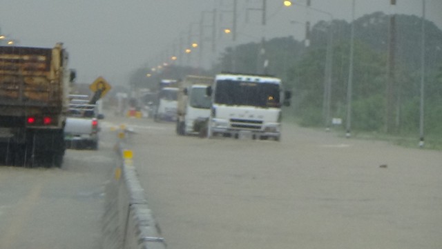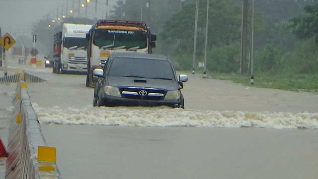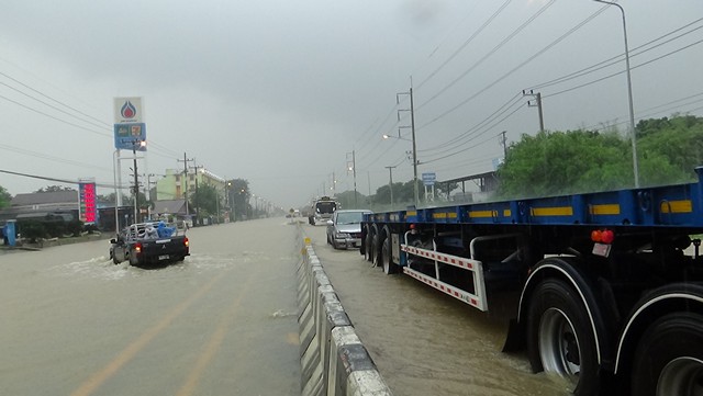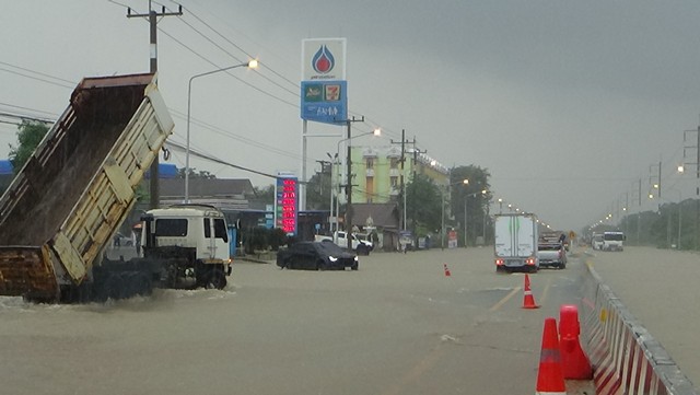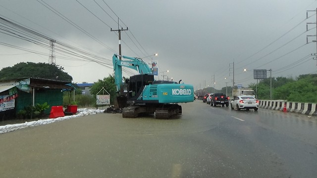 อ่างทอง-ป่าโมกอ่วม ถนนสาย 33 ท่วมหนักรถเล็กผ่านไม่ได้ ปิดการจราจร เร่งปั้นคันดินกู้ถนน