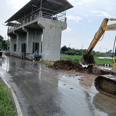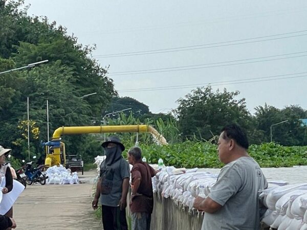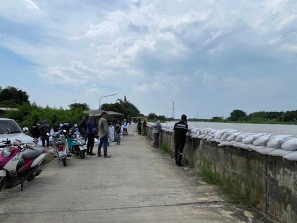 อ่างทอง-ปิดถนนข้ามประตูน้ำบางแก้ว นายอำเภอเมืองอ่างทองสั่งเร่งเสริม แนวกระสอบทรายริมคลองบางแก้ว