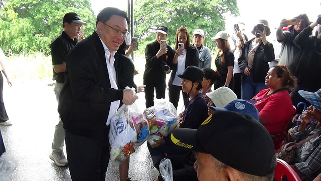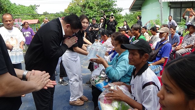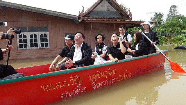อ่างทอง -หัวหน้าพรรคเพื่อไทย ลงเรือมอบถุงยังชีพ พร้อมเร่งรัฐบาลจัดการน้ำอย่างเป็นระบบ