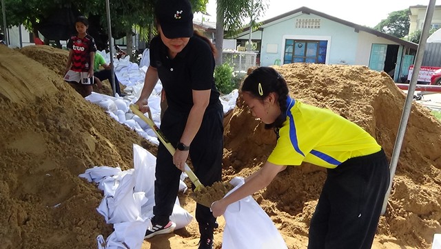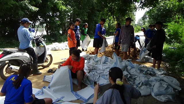 อ่างทอง -ไชโยได้รับผลกระทบ 600 ครัวเรือน ระดมทุกภาคส่วนรวมถึงนักเรียน เร่งเสริมคันกั้นน้ำ