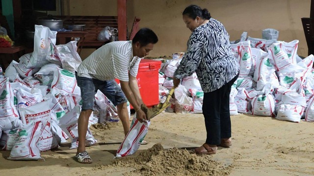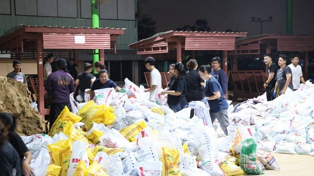 ปทุมธานี นำเครื่องดื่มมามอบให้เจ้าหน้าที่ที่ปฏิบัติหน้าที่ช่วยกันกรอกกระสอบทรายทำแนวกั้นน้ำเพื่อช่วยเหลือประชาชน
