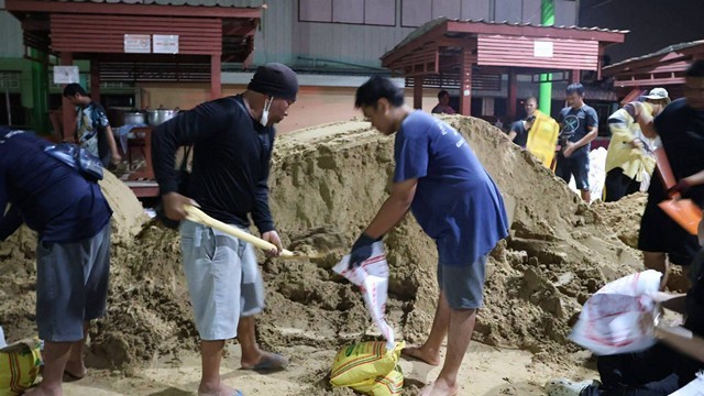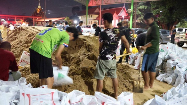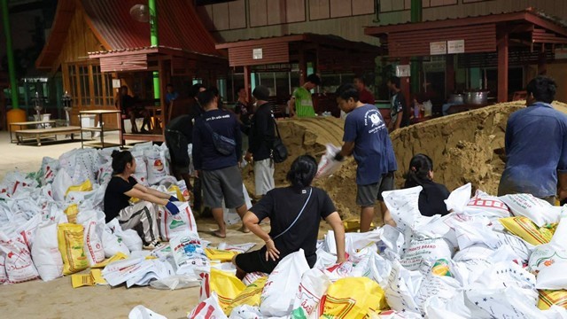 ปทุมธานี นำเครื่องดื่มมามอบให้เจ้าหน้าที่ที่ปฏิบัติหน้าที่ช่วยกันกรอกกระสอบทรายทำแนวกั้นน้ำเพื่อช่วยเหลือประชาชน