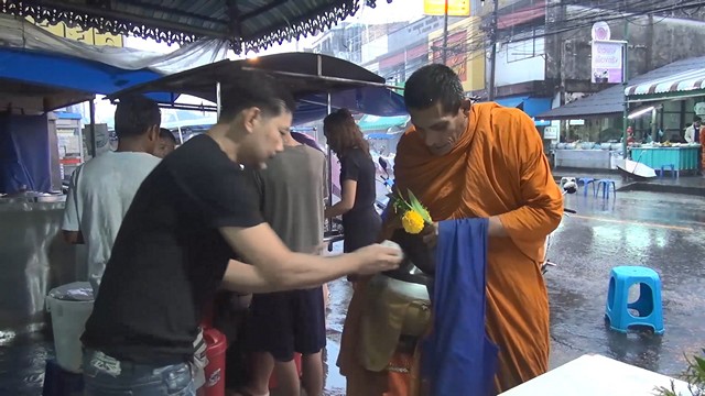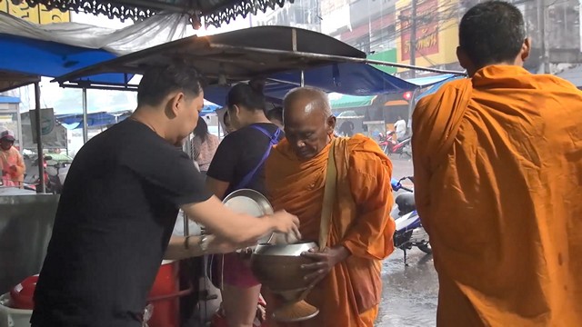 สงขลา-ประชาชนชาวสงขลาสวมเสื้อสีดำ-ขาวไว้ทุกข์ ออกมาทำบุญตักบาตรพระสงฆ์ท่ามกลางสายฝน ถวายเป็นพระราชกุศลแด่สมเด็จพระนางเจ้าสิริกิติ์ พระบรมราชินีนาถ พระบรมราชชนนีพันปีหลวง