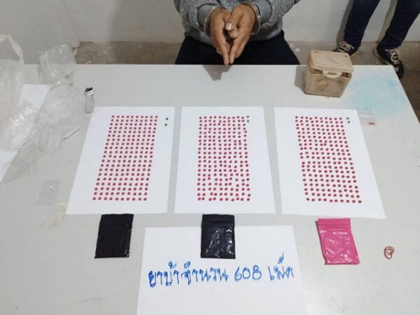 จากการตรวจค้นพบนายพงษ์ศักดิ์ หรือต้น (นามสมมุติ) อายุ 28 ปี แสดงตัวเป็นผู้ครอบครองสถานที่หลังดังกล่าว เจ้าหน้าที่จึงได้แสดงหมายค้นให้นายพงษ์ศักดิ์ฯดู พร้อมอ่านข้อความตามหมายค้นให้นายพงษ์ศักดิ์ฯฟัง ซึ่งจากการตรวจค้นบริเวณบ้านพบยาบ้า สีน้ำเงิน 2 ถุง สีชมพู 1 ถุง บรรจุอยู่ในถุงพลาสติกสีขาว รัดรวมกันด้วยหนังยางอีกชั้นหนึ่งฝังดินอยู่ใต้โต๊ะวางของใช้ใต้หน้าต่างข้างตัวบ้าน ซึ่งนายพงษ์ศักดิ์ฯ รับว่าเป็นยาบ้าของตนจริง นอกจากนี้ยังพบยาบ้าอีก 2 เม็ด ที่นายพงษ์ศักดิ์ฯ โยนทิ้งไว้ รวมยาบ้าทั้งหมด 608 เม็ด จึงตรวจยึดไว้เป็นของกลาง และนำตัวมาสอบสวนที่โรงพัก