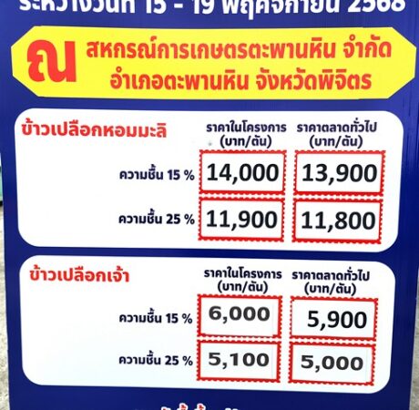 วันที่ 17 พฤศจิกายน 2568 นางสาวธนียา นัยพินิจ ผู้ว่าราชการจังหวัดพิจิตร ลงพื้นที่ตรวจเยี่ยมโครงการจัดตลาดนัดข้าวเปลือกปีการผลิต68/69ของจังหวัดพิจิตรที่สหกรณ์การเกษตรตะพานหิน จำกัด โดยมี นางสาวอุไรรัตน์ คำชื่นวงศ์ เกษตรและสหกรณ์จังหวัดพิจิตร, นายเอกวุฒิ ชุมวรฐายี พาณิชย์จังหวัดพิจิตร , นายกฤษฏิ์ สิทธิยศ ปลัดอำเภอ (เจ้าพนักงานปกครองชำนาญการพิเศษ) รักษาราชการแทน นายอำเภอตะพานหิน , ผู้จัดการสหกรณ์การเกษตรตะพานหิน ให้การต้อนรับ และดูบรรยากาศการรับซื้อข้าวเปลือกที่ สนง.พาณิชย์จังหวัดพจิตร จัดขึ้นในช่วงระหว่างวันที่ 15-19 พ.ย. 68 ซึ่งในแต่ละวันมีเกษตรกรเกี่ยวข้าวหอมมะลินำมาขายที่สหกรณ์การเกษตรตะพานหิน แห่งนี้วันละ 20-30 คันรถ