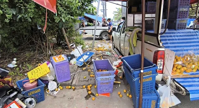 จากการให้สัมภาษณ์ของนายกิตติเดช พ่อค้าขายส้มได้ให้สัมภาษณ์ว่า ปกติตนขายส้มเสร็จก็จะมานอนพักที่เตียงพับอยู่เป็นประจำ แต่วันนี้ตนยังไม่ได้ลงไปนอน ก็ได้มีรถยนต์เก๋งพุ่งชนรถจักรยนต์ล้มแล้ววิ่งเข้ามาชนด้านข้างของรถปิกอัพแล้วพุ่งไปชนเสาเหล็กร้านค้าพัง และได้พบเตียงนอนแบบพับพังติดอยู่ด้านหน้ารถเก๋งด้วย ส่วนภรรยาได้รับบาดเจ็บกู้ภัยสว่างอริยะนำส่งโรงพยาบาลแล้ว