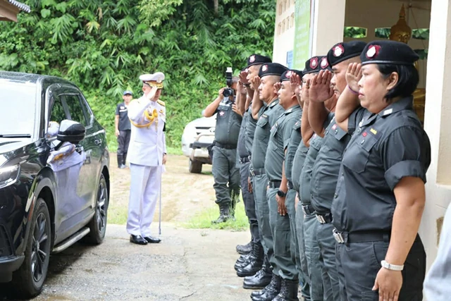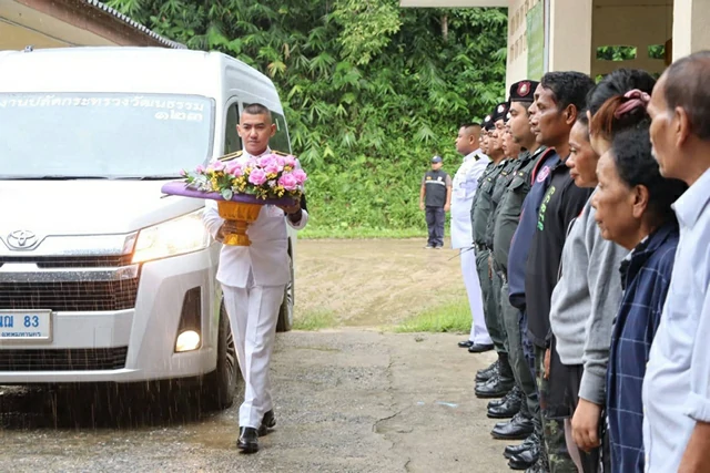 สตูล ผู้บัญชาการตำรวจตระเวนชายแดน เชิญพวงมาลาพระราชทาน วางหน้าหีบศพผู้เสียชีวิตจากเหตุการณ์ดินโคลนถล่ม จังหวัดสตูล